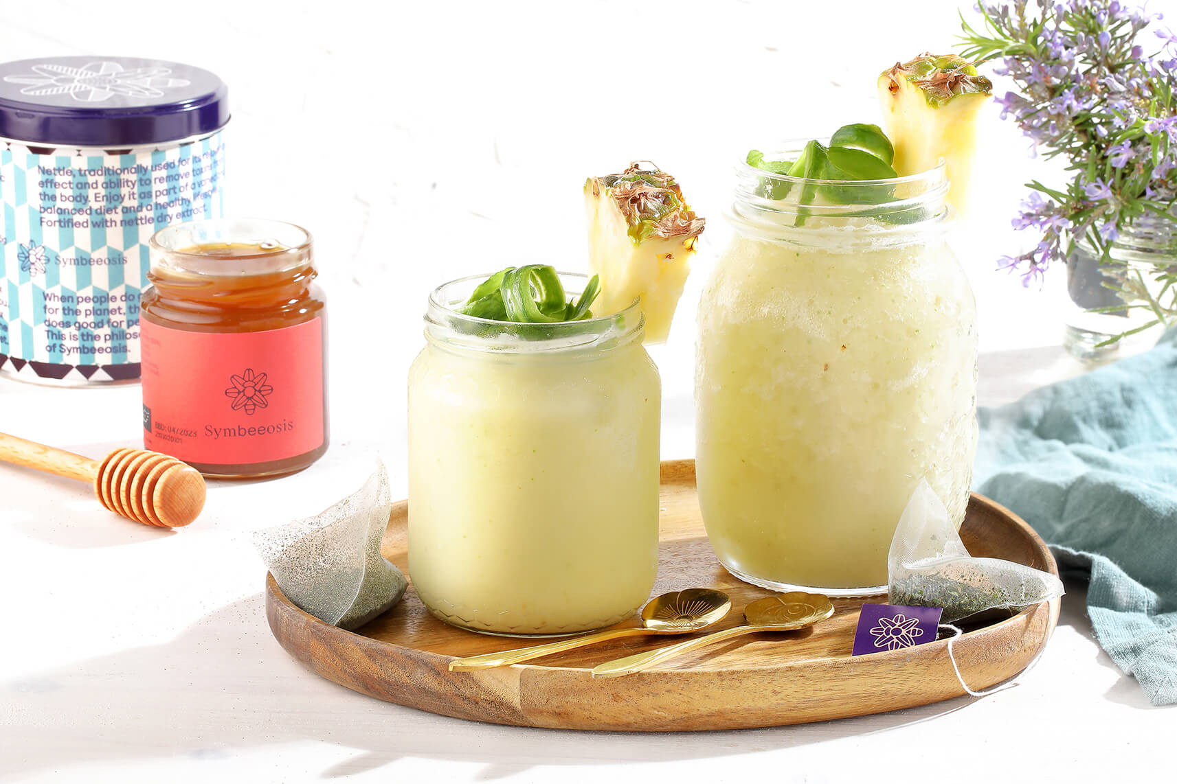 Προσθέστε το γάλα καρύδας στο μπλέντερ.Προσθέστε 1 πυραμίδα Βιολογικής Τσουκνίδας 250 ml νερό στους 95º για 4 λεπτά. Kαλύψτε το φλιτζάνι για να διατηρήσετε τα αρώματα.