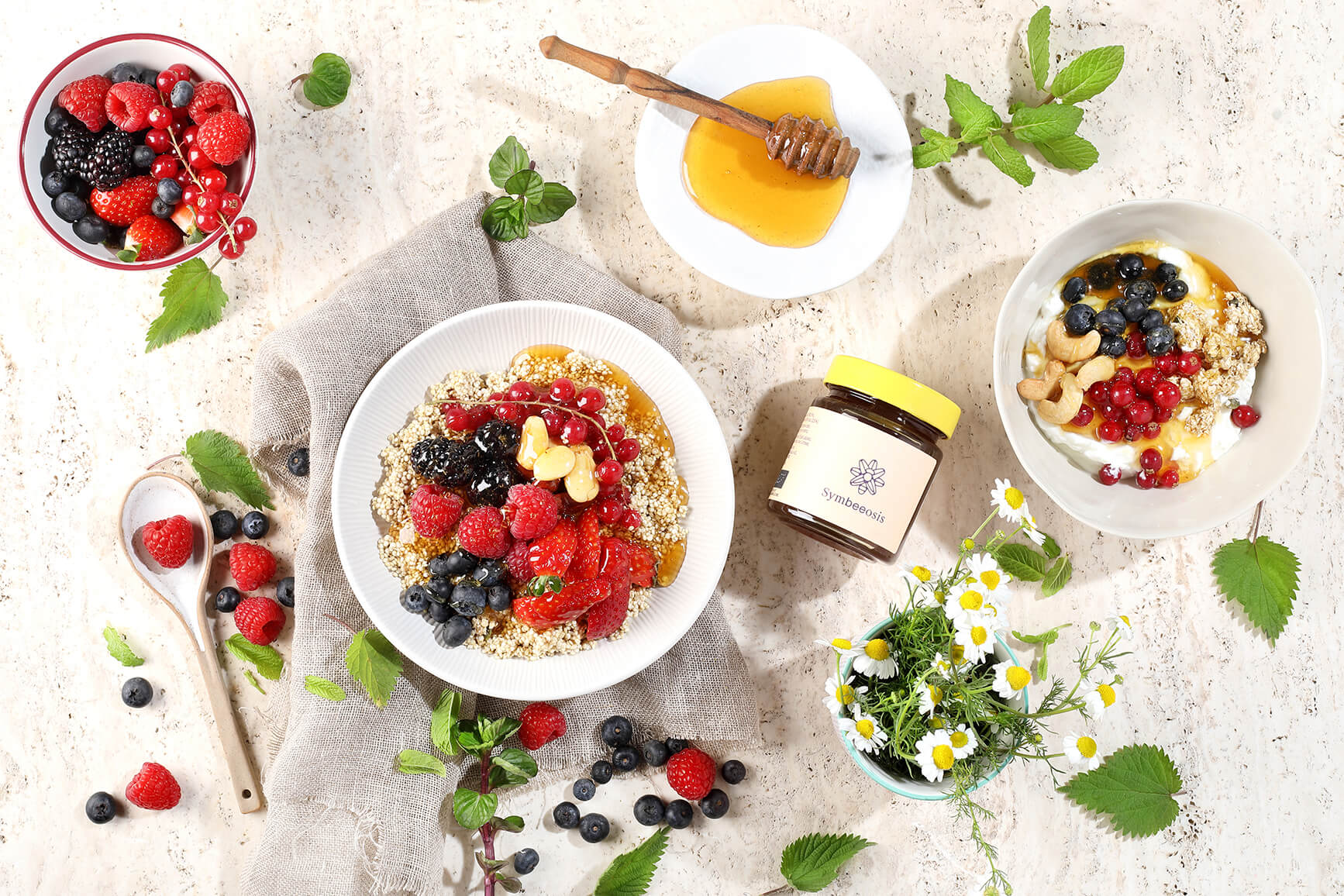 - Στη συνέχεια, προσθέστε το βιολογικό λειτουργικό μέλι με ginger Symbeeosis και τα φρούτα σε κομμάτια. Μπορείτε να προσθέσετε λίγο χυμό της αρεσκείας σας.