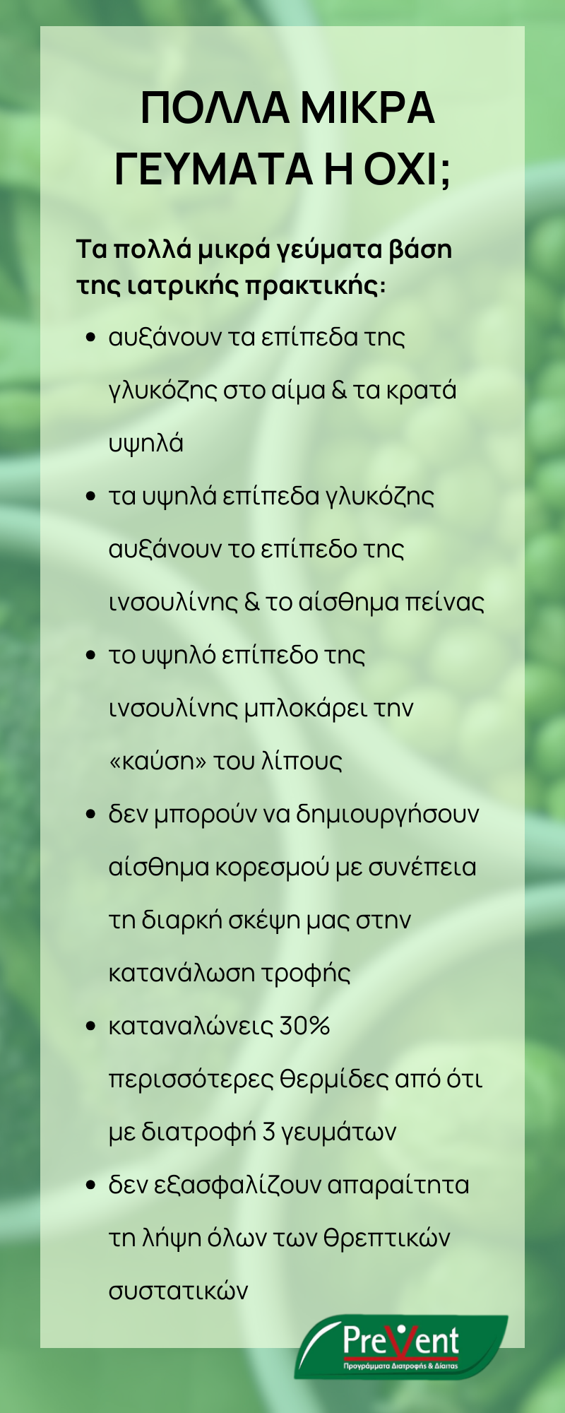Έχεις πιάσει τον εαυτό σου ποτέ να αναρωτιέται "Γιατί αυξήθηκε το βάρος μου;" χωρίς να μπορείς να προσδιορίσεις την αιτία της αύξησης βάρους σου ενώ κάνεις μια διατροφή; Συνήθως συμβάινει διότι είτε δεν κάνεις σωστά τη διατροφή σου είτε διότι τρως πολλά γεύματα μέσα στην ημέρα. Η εταιρεία Prevent, μας διαφωτίζει και μας ενημερώνει πως τα πολλά μικρά γεύματα έχουν καθιερωθεί σαν μέσο θεραπείας για ορισμένες παθήσεις (ειδικά του διαβήτη) και όχι για την καταπολέμηση της παχυσαρκίας. Πάμε να δούμε λίγο πιο αναλυτικά τι κάνουν τα πολλά μικρά γεύματα μέσα στη μέρα στη διατροφή μας.