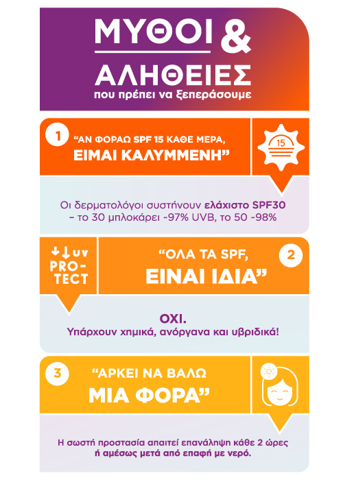 Αλήθεια: Η σωστή προστασία απαιτεί επανάληψη κάθε 2 ώρες ή αμέσως μετά από εφίδρωση ή επαφή με νερό. - Μύθος 4: Το SPF σώματος κάνει και για το πρόσωπο.