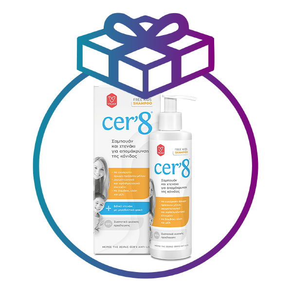 To CER’8 Free Kids Shampoo, με το ευχάριστο άρωμα πράσινου μήλου, είναι ειδικά σχεδιασμένο για χρήση μετά την εφαρμογή του Cer’8 Anti-Lice Spray για την εξάλειψη φθειρών, καθώς βοηθά στην αποκόλληση και την αποτελεσματική απομάκρυνση της κόνιδας από την τρίχα, χάρη στη μοναδική του σύνθεση με ξύδι φρούτων (μήλο, βερύκοκο, ροδάκινο) και γαλακτικό οξύ.